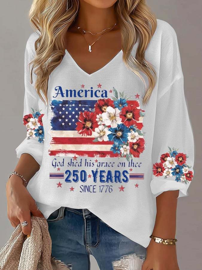 Women's 250th Anniversary National Flag Floral Print Waffle Long Sleeve T-Shirt